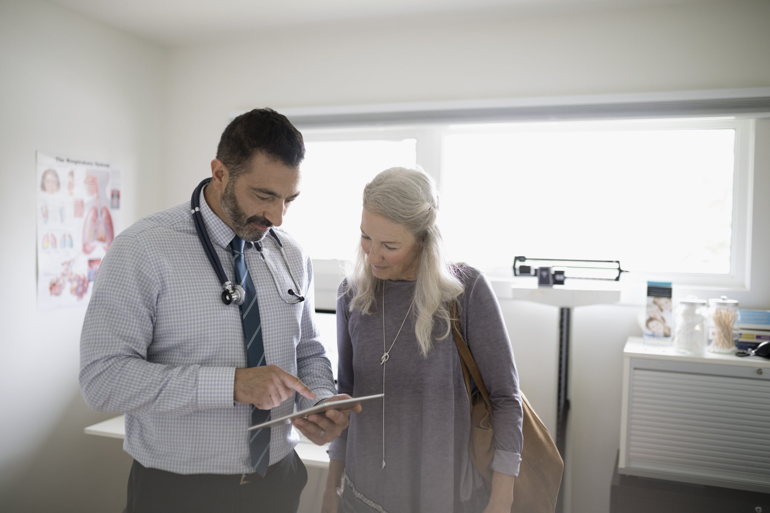 Male patient with digital tablet talking to senior female patient in examination room